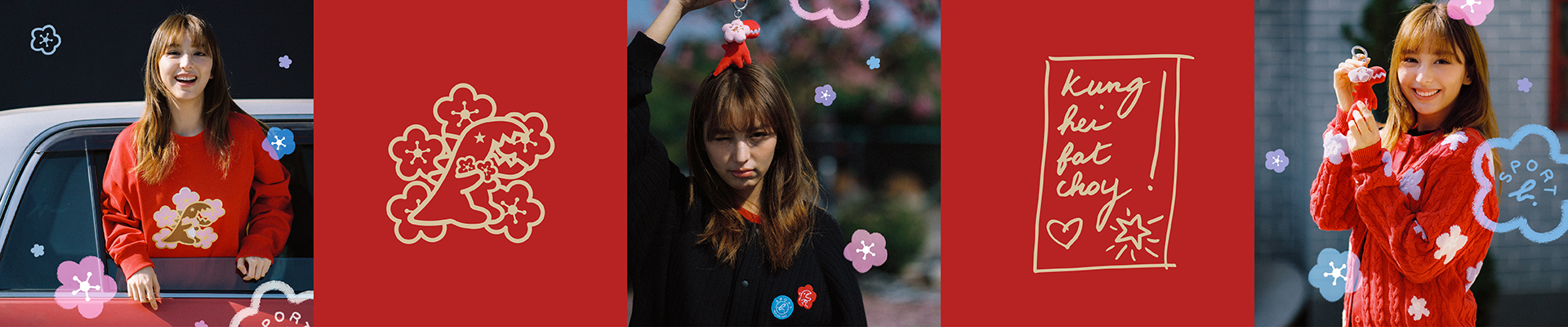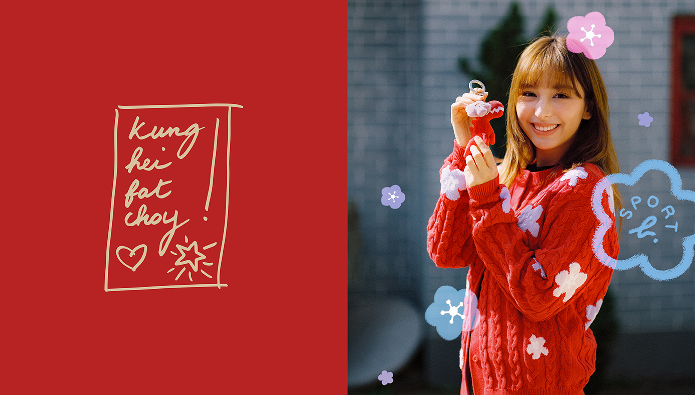Sport b.「Dino in Bloom」新春系列以可愛俏皮的 Dino 為主角,化身為品牌的「桃花信差」,傳遞愛與好運,迎接充滿希望的馬年!系列以朝氣滿滿的紅色為主調,結合桃花與 Dino 的玩味圖案,為新年造型注入幸福與活力。